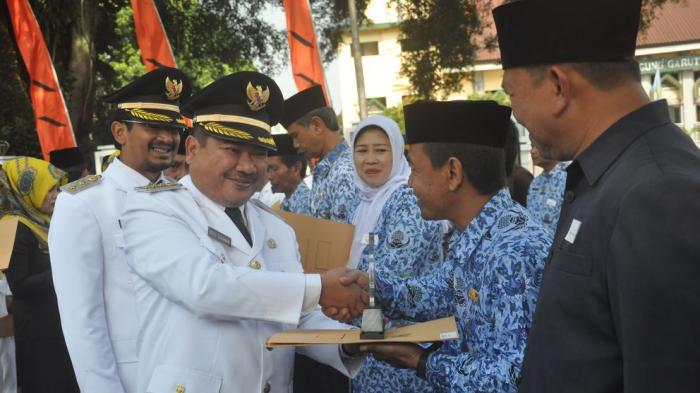 Bupati Garut memberi penghargaan kepada para camat, kepala desa, pegawai, dan warga Garut, di upacara Hari Jadi Garut. (FOTO: TRIBUN JABAR/M SYARIF ABDUSSALAM)