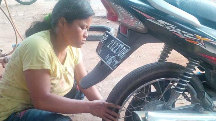 Tidak seperti lazimnya perempuan kebanyakan, ibu dua anak ini rela bekerja sebagai penambal ban untuk membantu sang suami.