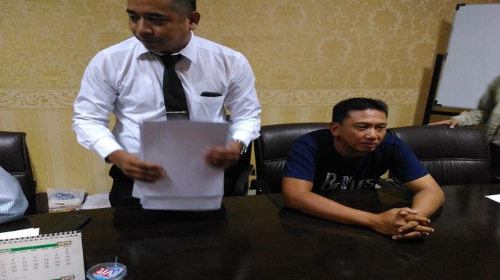 Taufik berambut cepak menggunakan kaus hitam didampingi tiga sampai empat pengacara ketika memberikan keterangan kepada media.