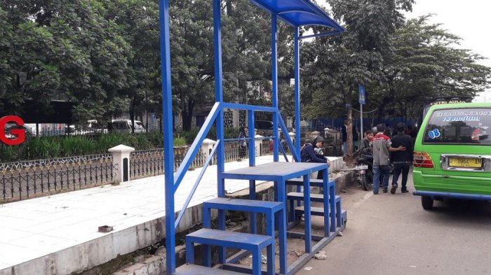 Berdasarkan pantauan Tribun Jabar, halte portable tersebut terbuat dari besi dan berwarna biru.