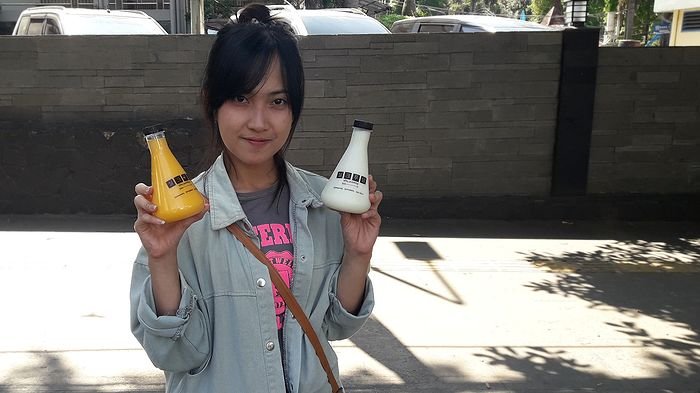 Rupanya, perempuan berkulit putih, memakai jaket jins berwarna biru muda itu sedang berjualan produk puding siap minum dalam kemasan botol.
