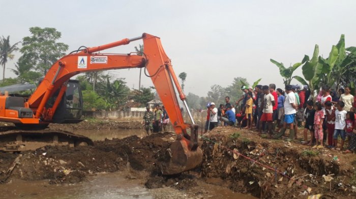 TRIBUNJABAR.ID, BOJONGSOANG - Puluhan warga RW 9 dan 10 Kampung Cijagra, Desa Bojongsoang, Kecamatan Bojongsoang, Kabupaten Bandung berbondong-bondong menyaksikan langsung dibongkarnya tanggul sementara menggunakan alat berat, Rabu (21/3/2018).