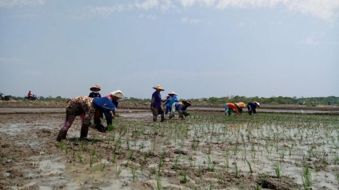 Pantauan langsung Tribun Jabar, puluhan buruh tani sedang menanam padi.