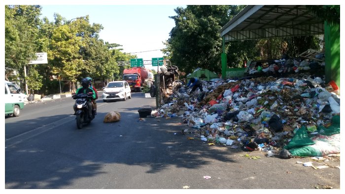 Akibatnya, gunungan sampah setinggi kira-kira 2 meter itupun meluber ke badan jalan.