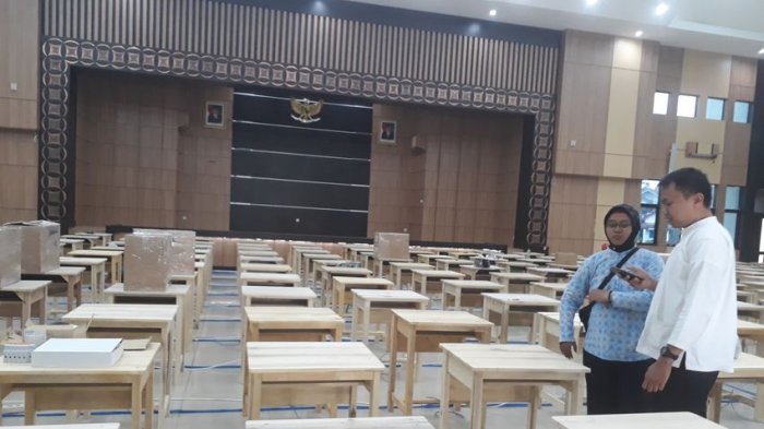 Selain meja dan kursi, terlihat beberapa petugas tengah memasang instalasi komputer yang nantinya akan digunakan selama tes.