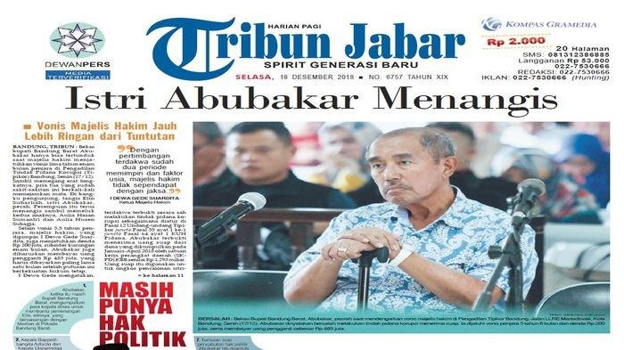 HEADLINE koran TRIBUN JABAR edisi Selasa 18 Desember 2018, menyajikan laporan utama tentang bekas bupati Bandung Barat Abubakar hanya bisa tertunduk saat majelis hakim menjatuhkan vonis lima tahun enam bulan penjara di Pengadilan Tindak Pidana Korupsi Bandung, Senin (17/12/2018).