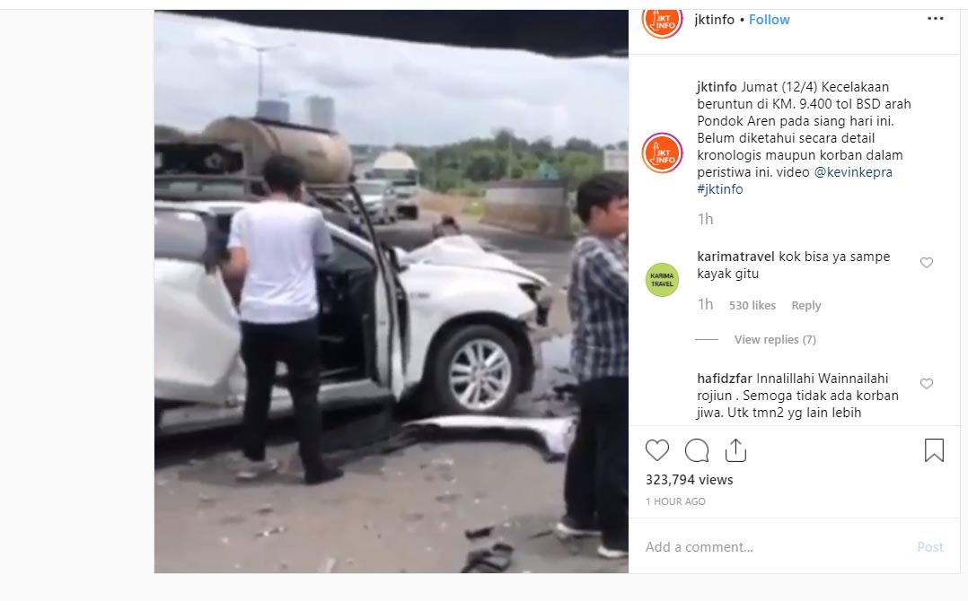 Kecelakaan beruntun ini terjadi di KM 9+400 Tol JORR arah BSD seperti diupload oleh akun jktinfo, siang ini.