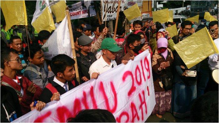 Pelaksana tugas (Plt) Sekretaris KPU Jawa Barat Teppy W Dharmawan menemui Mahasiswa yang terhimpun dari KAMMI Jabar yang berunjukrasa di depan kantor KPU Jawa Barat, Rabu (22/5/2019) Bandung.