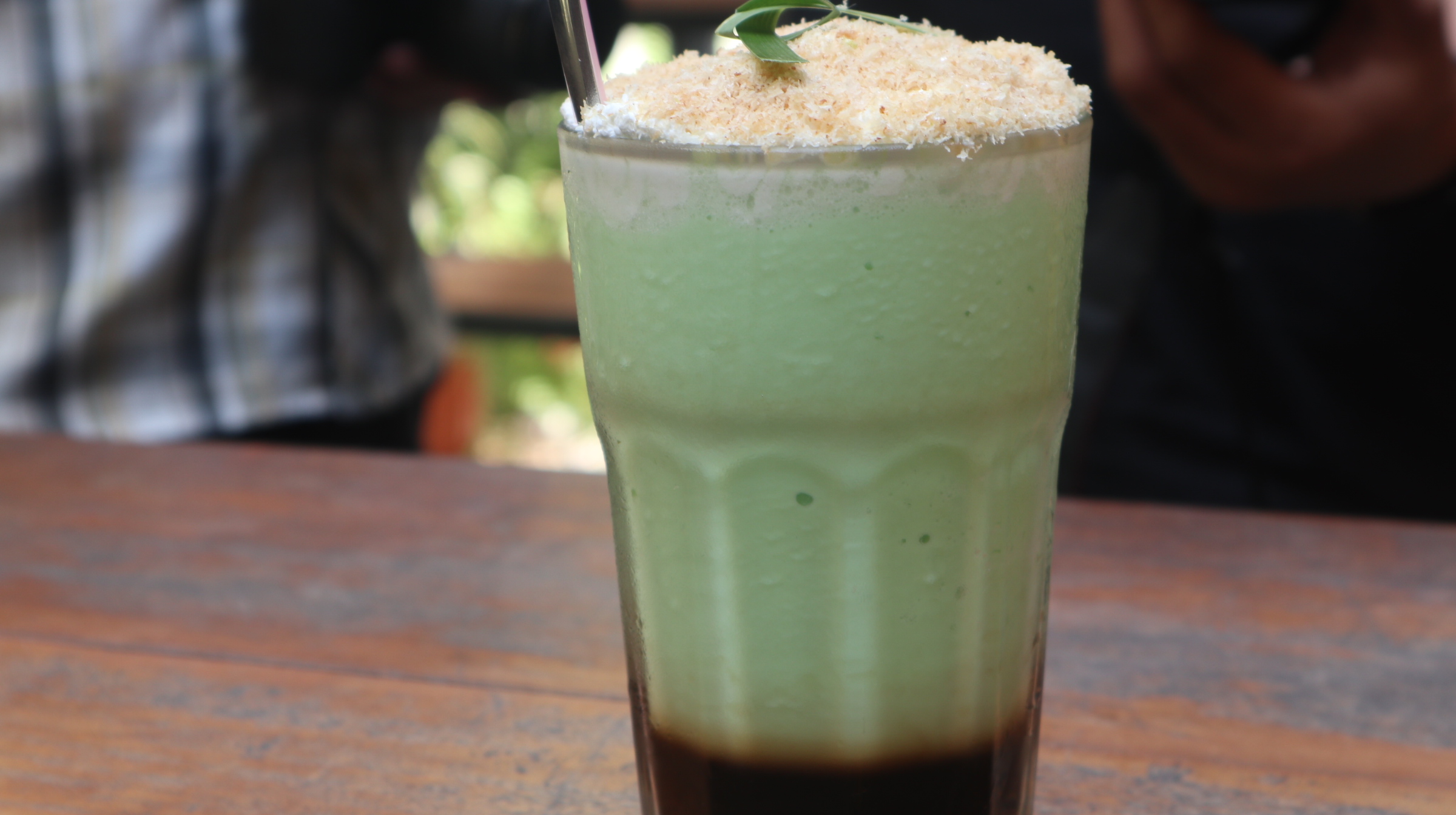 Dari tampilannya pun minuman ini sudah membuat penasaran karena berwarna hijau muda. Di bagian frappe-nya terdapat serpihan kelapa mirip serundeng.