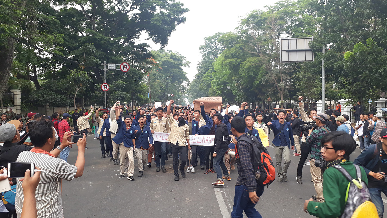 Kelompok yang terus berdatangan itu merupakan mahasiswa yang menggunakan jas almamater masing-masing kampusnya.