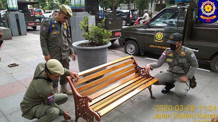 Satpol PP Kota Bandung terpaksa mencabut sementara sejumlah kursi di kawasan Taman Alun-alun Kota Bandung, Sabtu (28/3/2020).