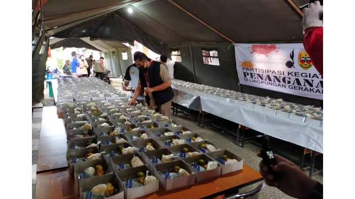 Dapur umum ini setiap hari menyediakan sebanyak seribuan porsi nasi dilengkapi sayur dan lauk yang dikemas dalam paket nasi kotak.