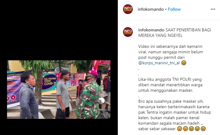 "Kenapa kau tak mau memakai masker?," tanya anggota TNI tersebut.
