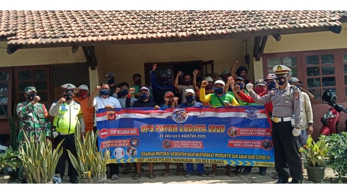 TRIBUNJABAR.ID, SUBANG - Jajaran Polsek Pamanukan Polres Subang menggelar Sosialisasi Operasi Patuh Lodaya 2020, dan Pemberian Masker Kepada Karyawan Gudang Pupuk Kujang di Dusun Batang Gede Desa Mandala wangi Kecamatan Sukasari Kabupaten Subang, Senin (3/8/2020).