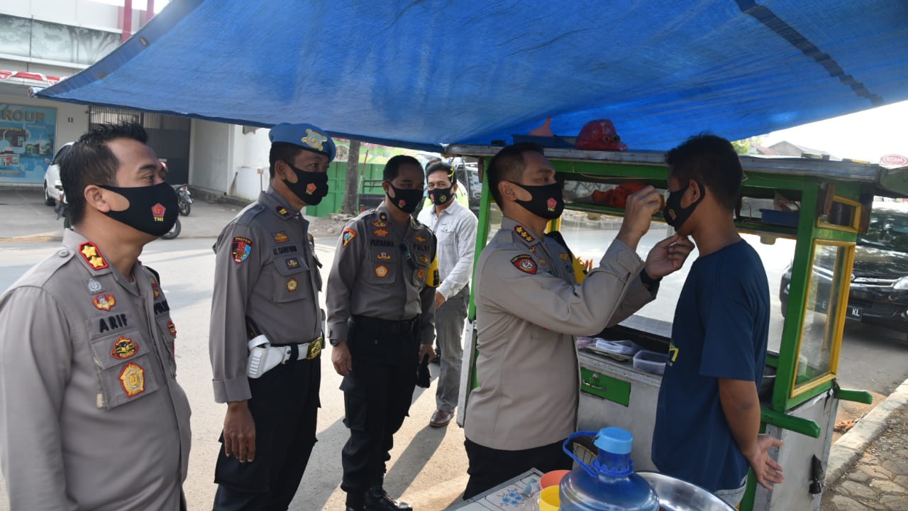 Kapolreste Cirebon berkeliling. Ia memberi hadiah kepada warga yang tak memakai masker.
