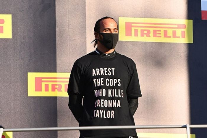 Saat naik ke podium kampiun, Hamilton menggunakan kesempatan tersebut dengan memakai kaus antirasisme yang menyasar ke aksi brutal polisi terhadap warga kulit hitam di Amerika Serikat (AS).