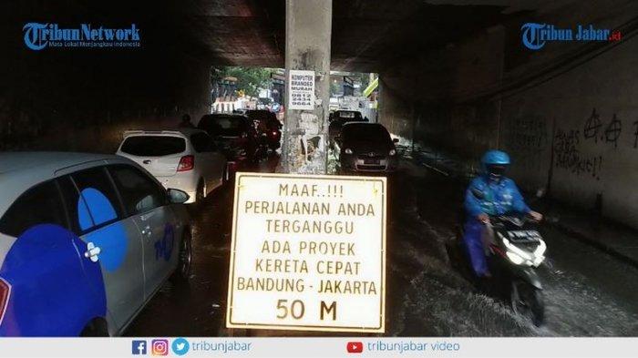 Banjir yang terjadi saat hujan deras mengguyur Bandung sekitar pukul 14.00 akibat tersumbatnya saluran air yang ada di proyek pengerjaan kereta cepat Jakarta-Bandung