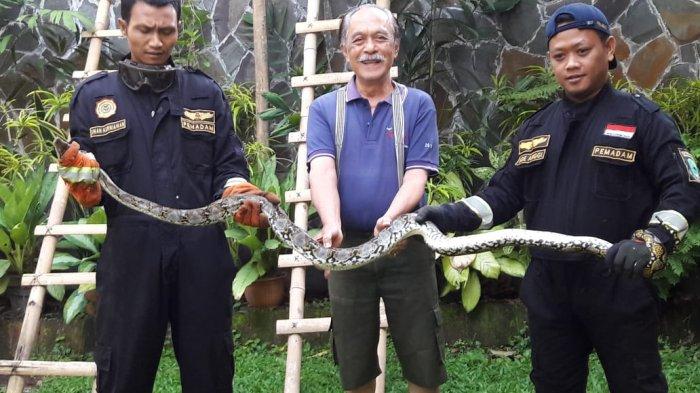TRIBUNCIREBON.COM,KUNINGAN – Petugas pemadam Kuningan berhasil melakukan penangkapan ular jenis sanca (phyton) yang berada di halaman rumah milik ibu Aminah (96).