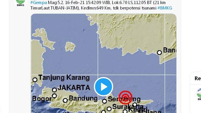 "#Gempa Mag:5.2, 16-Feb-21 15:42:09 WIB, Lok:6.70 LS,112.05 BT (21 km TimurLaut TUBAN-JATIM), Kedlmn:649 Km, tdk berpotensi tsunami #BMKG," tulis unggahan BMKG.