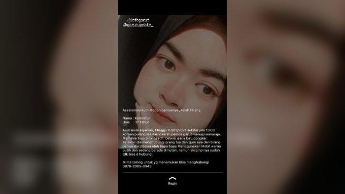Tangkapan layar gadis SMA asal Garut yang ternyata diculik. Keluarga korban sudah lapor ke polisi.