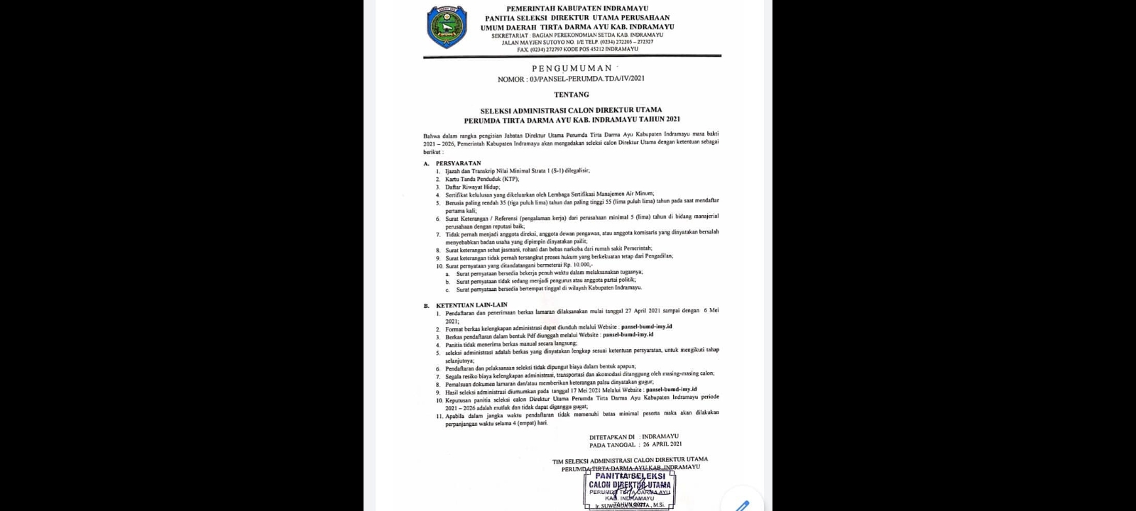 Berikut ini informasi lengkap tentang seleksi administrasi bagi Calon Direktur Utama Perumda Tirta Darma Ayu Kabupaten Indramayu