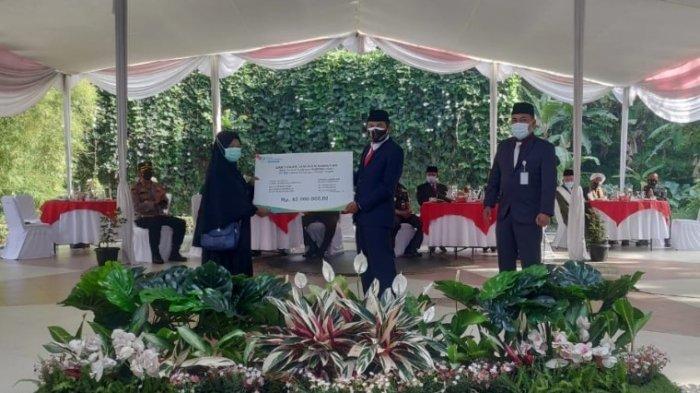 TRIBUNJABAR.ID, BANDUNG - Pelaksana Tugas (Plt.) Wali Kota Cimahi Letkol Inf (Purn) Ngatiyana didampingi Kepala Kantor Cabang BPJS Ketenagakerjaan (BPJAMSOSTEK) Cimahi, Agus Suprihadi menyerahkan secara simbolis santunan Jaminan Kematian (JKM) kepada ahli waris tenaga kerja peserta BPJAMSOSTEK, Ridwan Abraham yang meninggal dunia pada Rabu (5/5/2021) dengan tetap memperhatikan protokol COVID-19.