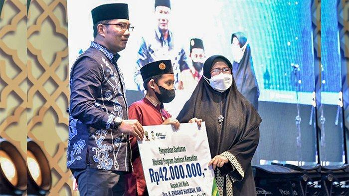 TRIBUNJABAR.ID - Gubernur Jawa Barat, Ridwan Kamil menyerahkan santuan manfaat Program Jaminan Kematian (JKM) dari BPJS Ketenagakerjaan atau BPJAMSOSTEK sebesar Rp42 juta kepada ahli waris KH Endang Hamzah.