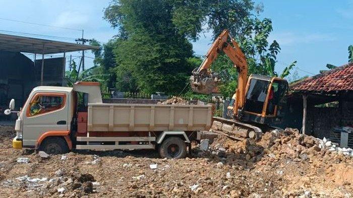 Pada pembongkaran hari ketiga, pekerja mengeruk tanah urukan menggunakan ekskavator.