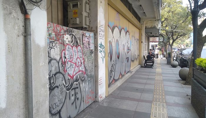 Mulai dari tempat duduk, pot tanaman, batu bulat, tembok, hingga rolling door tidak luput dari vandalisme.