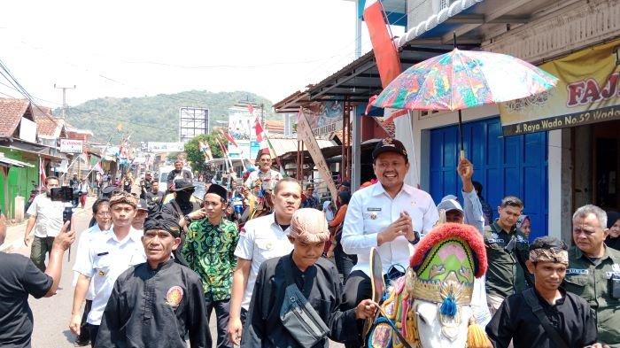 Sampai di pusat acara, di alun-alun Kecamatan Wado, Umuh Muchtar dan Bupati disambut tarian pencak dengan musik padungdung yang dipadukan dengan angklung.