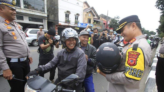 Kapolres Cimahi AKBP Aldi Subartono (kanan) memberikan helm gratis kepada pengendara yang tidak mengenakan helm di depan Mapolresta Cimahi, Rabu (8/2/2023). Kegiatan Operasi Keselamatan ini untuk memberikan edukasi pentingnya keselamatan bagi pengendara.