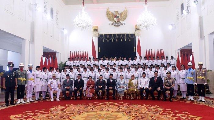 Presiden Jokowi saat mengukuhkan Paskibraka di Istana Negara, Jakarta, Selasa (15/08/2023). Berikut adalah daftar 76 nama anggota paskibraka dari 38 provinsi yang dikukuhkan Presiden Jokowi.