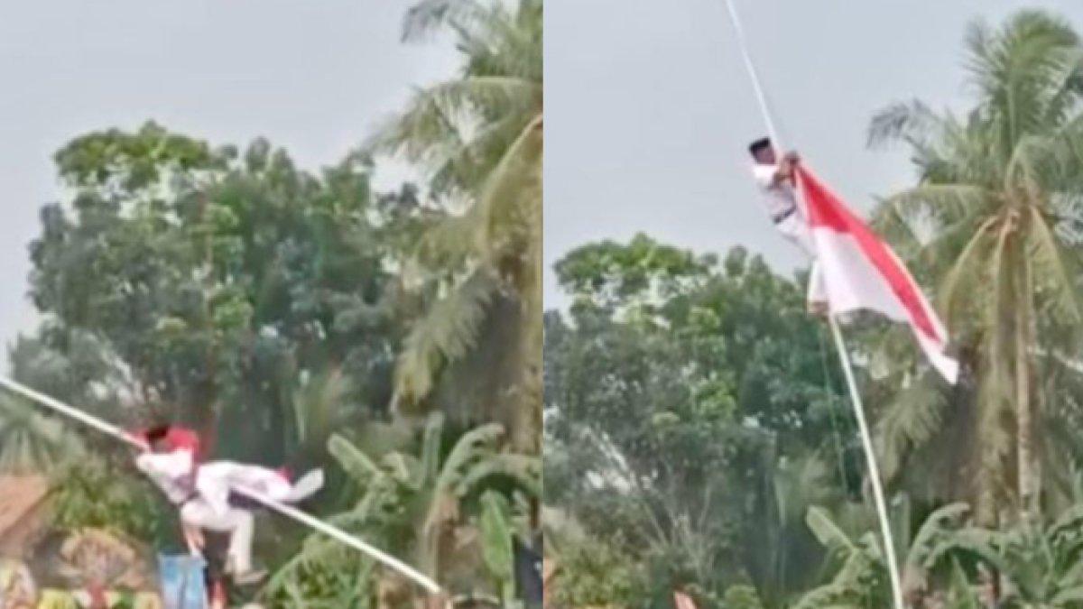 Niat hati membetulkan bendera yang tersangkut, pelatih paskibra tersebut justru mengalami insiden terjatuh dari tiang.