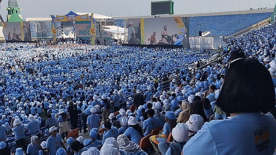 Massa yang hadir pun langsung menjawabnya dengan meneriakan nomor dua, hingga stadion menggema karena banyaknya orang yang berteriak.