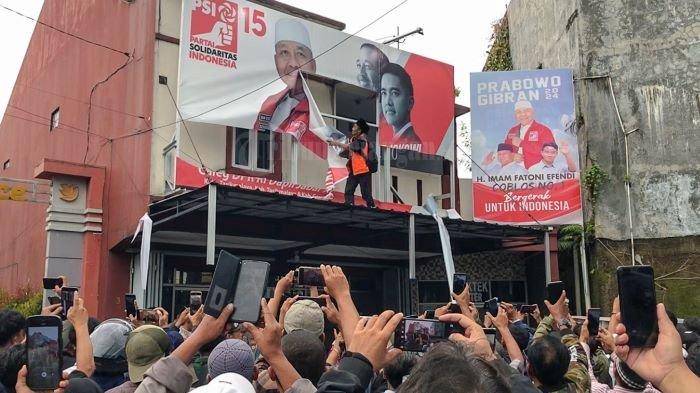 Aksi tersebut juga diwarnai pembongkaran baliho calon legislatif (caleg) DPR RI dari Partai Solidaritas Indonesia (PSI) yang terpasang di bangunan Posko Pemenangan PSI.