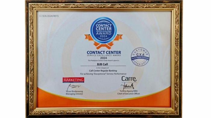 TRIBUNJABAR.ID - Bandung, - bank bjb meraih penghargaan kategori Call Center Regular Banking melalui layanan bjb Call dengan mendapatkan score index 96,364 (Exceptional, Mostly Happier Customers) pada gelaran Contact Center Service Excellence Award (CCSEA) 2024 yang diselenggarakan Majalah Marketing bekerjasama dengan Carre CCSL, lembaga konsultan riset kepuasan dan loyalitas pelanggan yang mengadakan pemantauan dan penilaian kinerja atas 243 call center, 55 email costumer service, 44 Twitter service dan 12 chat services dan 9 Whatsapp Services di Indonesia.