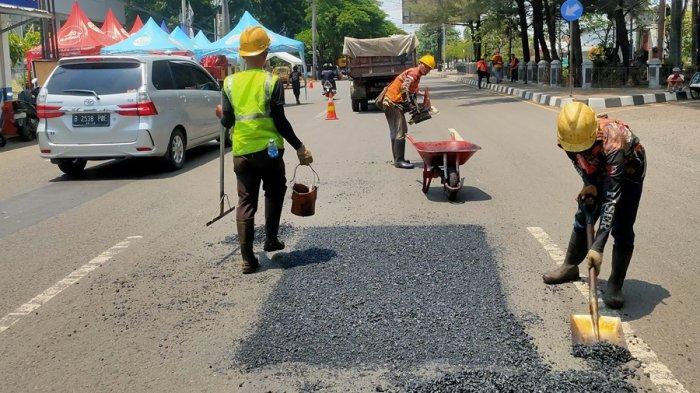 Proses perbaikan jalan, salah satunya dilakukan di Jalan Raya Kalijaga, Kecamatan Lemahwungkuk, Kota Cirebon.