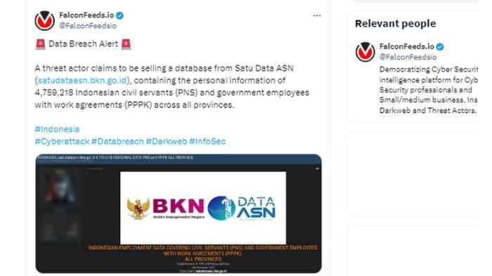 "Seorang pelaku ancaman mengaku menjual basis data dari Satu Data ASN (http:// satudataasn.bkn.go.id)," tulis pengunggah.