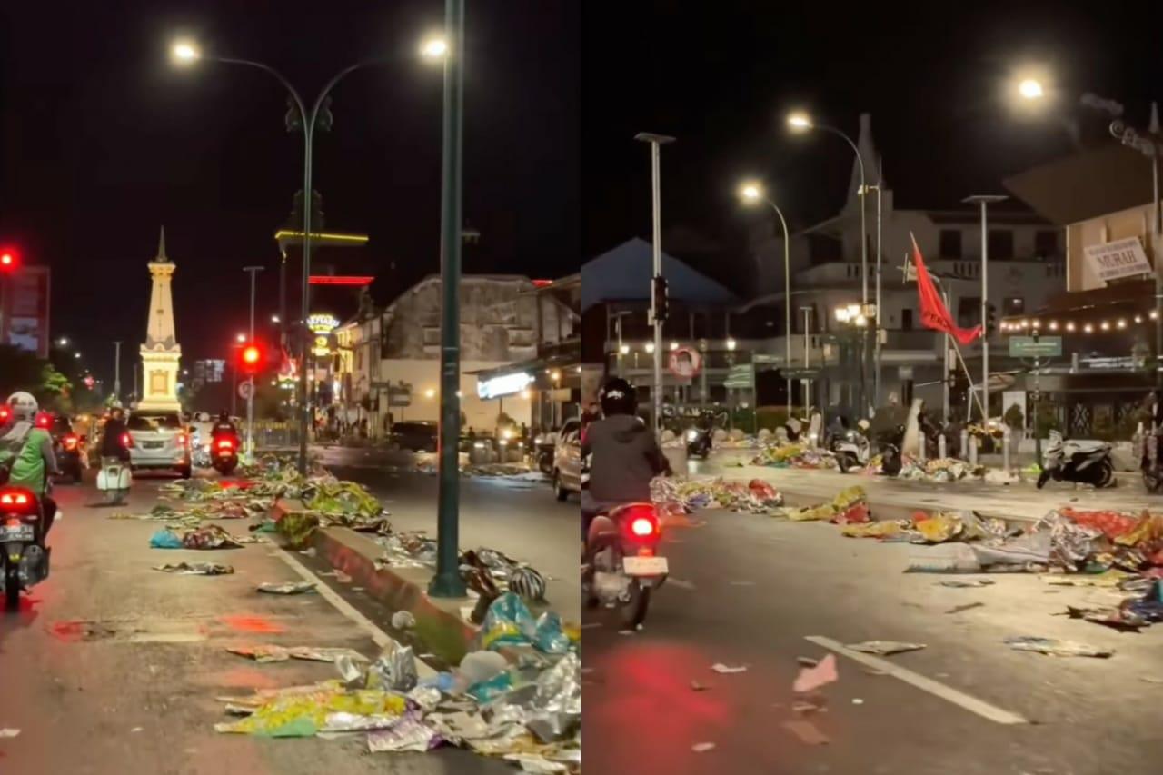 Video penampakan kawasan Tugu Yogyakarta dipenuhi sampah usai malam Tahun Baru 2025, viral di media sosial. Kelakuan pengunjung disentil warganet