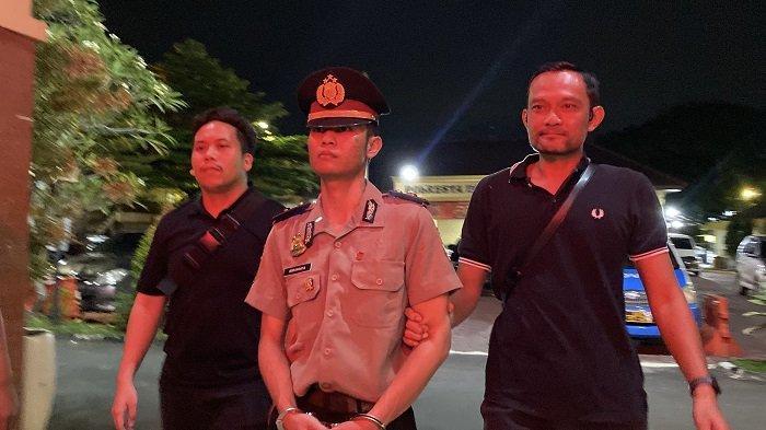Menggunakan seragam polisi lengkap pangkat Iptu, W digiring dengan tangan diborgol oleh beberapa orang Tim Resmob Polresta Bogor Kota.