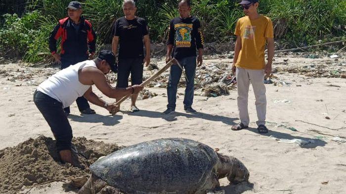 Penyu hijau berukuran raksasa ditemukan mati tergeletak di Pantai Legok Salenggang, Desa Buniwangi, Kecamatan Surade, Kabupaten Sukabumi.