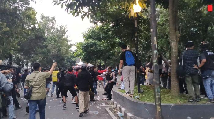 TRIBUNJABAR.ID, SUKABUMI - Kericuhan sempat terjadi pada aksi unjuk rasa di Gedung DPRD Kota Sukabumi. Penyebabnya adalah ada yang melakukan pelemparan botol air mineral dari belakang massa.