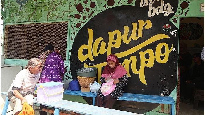 DAPUR. Sejumlah perempuan lanjut usia tampak duduk di sebuah bangku kayu sederhana berwarna biru tua di...
